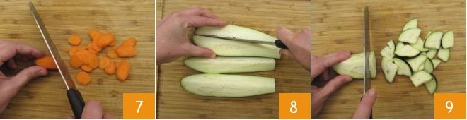 then do the same with the carrots 7. Finally, divide the eggplant into quarters lengthwise 8 and slice them to obtain triangles about 1/4 inch thick 9.