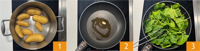 To prepare the vegetarian potato gateau, first boil the potatoes starting from cold water and cook for about 40 minutes from the boil 1. Meanwhile, cook the spinach: heat a drizzle of olive oil in a pan with the garlic 1, then add the spinach 3 and a pinch of salt.