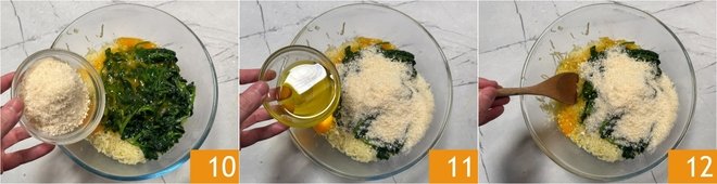 Also add the grated cheese 10 and the oil 11, then mix the ingredients together 12.