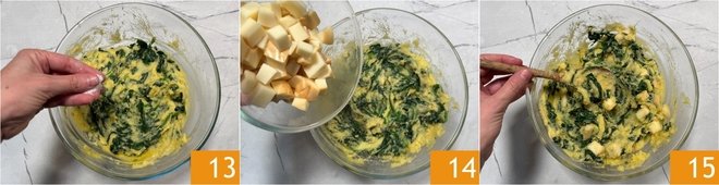 Season with salt 13 and pepper. Finally, fold in the scamorza cubes 14 and mix well to obtain a homogeneous mixture 15.