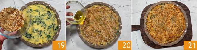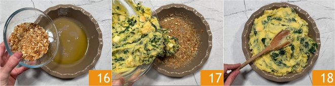 Now take a flared pan with a base diameter of 7 7/8 inches and a top diameter of 10 1/4 inches, oil the bottom and sprinkle half of the breadcrumbs 16. Pour the potato mixture inside 17 and level it 18.