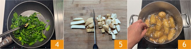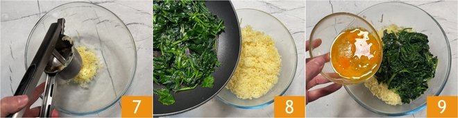 Drain the potatoes and mash them in a bowl (the skin will remain in the ricer) 7. Add the spinach 8 and the beaten eggs 9.
