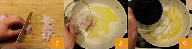Set the seafood preparations aside and focus on cooking the venere rice: chop the shallot 7 and pour it into a large pan with a drizzle of oil 8. Sauté over low heat, avoiding burning the shallot, then add the venere rice 9.