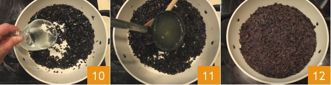 Toast the rice, then after 5 minutes pour in the white wine 10 and gradually add the fish stock 11 to aid in cooking the venere rice (this type of rice has a very long cooking time, you can halve the time using a pressure cooker or by purchasing precooked venere rice). Towards the end of cooking, add a bit of rice starch which will make the arancini more compact when you form them. Finish cooking and turn off the heat 12.