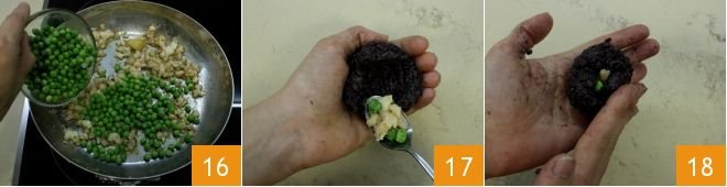 Add the peas 16 and cook for a few minutes (if using frozen peas, you can blanch them in boiling water for a few minutes first); then remove the garlic and turn off the heat. Let the preparations cool and once cold you can form the arancini: moisten your hands with a little oil, then flatten some rice on the palm of your hand and create a hollow in the center. Pour the filling inside the rice 17 and close 18 forming a ball. To give the classic arancino shape, form the ball then pinch one side to form an apex.