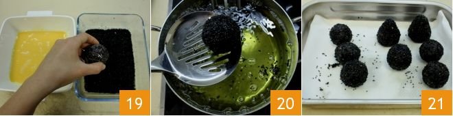 In a bowl, beat the eggs and prepare the black sesame seeds; then roll the arancini first in the beaten egg and then in the black sesame seeds 19, carefully covering the entire surface. Fry one or two arancini at a time in plenty of seed oil (it should not exceed 338°F) 20, then place them on a tray covered with paper towels 21. Serve your arancini hot or warm!
