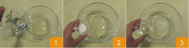To prepare the arepas, take a large bowl and pour in the water 1, salt 2, and oil 3, then mix to dissolve the salt.