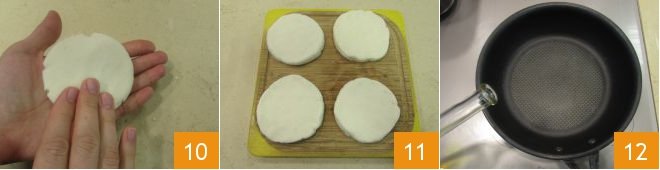 then shape them on the work surface to obtain a regular shape 10. After forming the discs 11, heat the oil in a pan 12