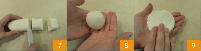 After this time, divide the dough into portions of about 3 oz each 7: form balls 8 and flatten them on the palm of your hand to a thickness of 0.6 inches 9,