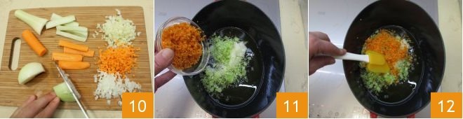 Once the necessary marination time has passed, finely chop the peeled onion, washed and peeled celery and carrot. Then finely chop everything and add it to a pan with extra virgin olive oil and the butter, which will have melted by now 11. Sauté the mixture for about 10 minutes over a very low heat, stirring occasionally 12.