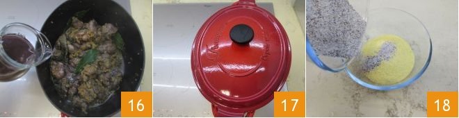 and the marinade 16. Adjust with salt and pepper, cover with a lid, and cook over a very low flame for at least 4 hours, until the meat is well cooked and tender. When three hours of cooking the venison have passed, start preparing the polenta: mix the two flours slowly 18,