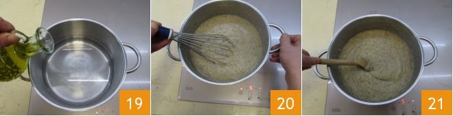 then in a high-sided pot, put 6 cups of water, salt, add the oil 19, the flours, and stir a bit with a whisk 20. Take a wooden spoon and continue stirring, cooking for about an hour 21. The polenta should thicken and become
