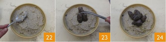 Once the venison is cooked and the polenta is ready, serve the venison stew by first placing the polenta on the plate 22 and then the meat on top 23, using tongs. Your venison stew with buckwheat polenta is ready to be enjoyed! 24