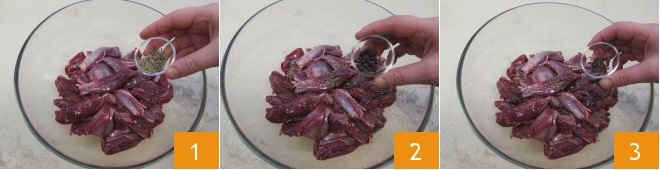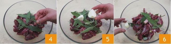 To prepare venison stew with buckwheat polenta, first start with marinating the meat. Begin by rinsing the venison under running water, then place it in a bowl and add the wild fennel 1, juniper berries 2, and cloves 3,