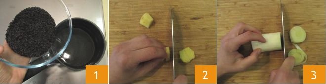 To prepare the Venus rice and swordfish cups, first of all, pour the rice into plenty of salted water 1 and cook for about 40 minutes. Meanwhile, peel the ginger and cut it into coarse pieces 2, then clean the leek and cut it into rings 3.