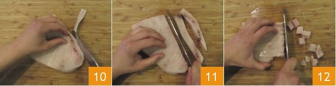 Now move on to preparing the swordfish steak: remove the skin 10 and cut it first into strips 11 and then into cubes 12.