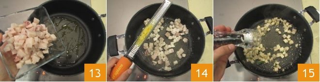 Heat a drizzle of oil in a saucepan, add the swordfish cubes 13 and sauté them for about 5 minutes over high heat, seasoning with grated lemon zest 14, salt, and pepper 15.
