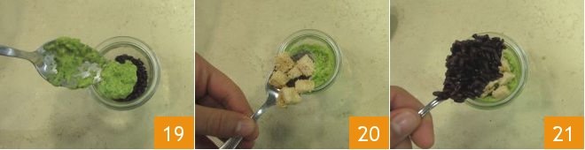 When the rice cooking time is up, drain it 16 and transfer it into a bowl, then season it with a drizzle of oil 17 and a grind of pepper and mix well. At this point, you can assemble your appetizer: we used glass cups with a diameter of 2.5 inches. Place a first layer of Venus rice at the base 18,