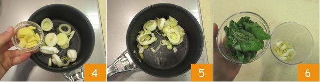 Heat a drizzle of oil in a small saucepan and sauté the leek and ginger for a few minutes (4-5). Transfer the sauté into a tall and narrow glass, add the basil leaves which you have previously washed and dried 6