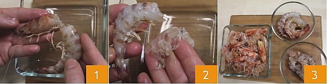 To prepare Venus rice with prawn tails, start by cleaning the prawns: remove the heads 1, tails (keep only six prawns with the tail), and shells 2 (for more details, see the How to clean shrimp). Set aside the prawn carcasses 3 because they will be the base of your fish stock (for more details on how to prepare crustacean broth, see the Shellfish Stock).