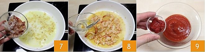 When the shallot is golden, add the prawns, let them brown for a few minutes 7, and deglaze with a bit of water 8. Mix the tomato paste with the tomato pulp 9 and