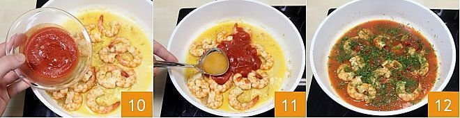 add it to the prawns 10. Deglaze everything with the crustacean broth 11, mix and sprinkle with 1 tablespoon of dill and 1 tablespoon of chives 12. Now let the sauce cook until it is thick but not too dry.