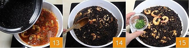 Drain the Venus rice al dente 13 and toss it in the pan with the sauce for five minutes 14. Your Venus rice with prawn tails is ready; sprinkle with the chopped dill and chives 15, then serve.