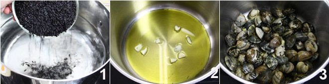 In a pan, place two tablespoons of oil and a garlic clove to brown 2; then throw in the clams 3, wait until they open, then turn off the heat.
