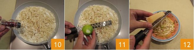 Add more freshly ground pink pepper 10 and the finely grated lime zest 11 and finish mixing everything. Plate your vermicelli with lime and pink pepper and finish the dish with a sprinkle of grated grana cheese 12.