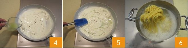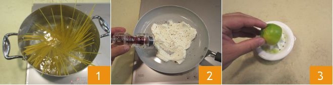 Then pour the lime juice into the pan 4 and mix with a spatula 5 to incorporate it into the mascarpone. Drain the pasta al dente, keeping the cooking water aside 6.