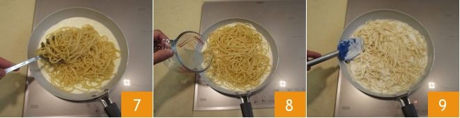 Transfer it directly to the pan with the mascarpone 7, add a ladle of cooking water 8 and continue stirring so that the mascarpone, with just the heat of the water, softens and becomes a cream 9.
