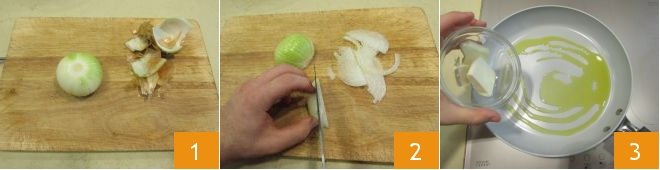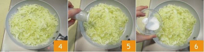 then add the onions 4, season with salt 5 and sugar 6, and let them cook, still over low heat, for 30-40 minutes, so the onions soften; if necessary, you can add a few tablespoons of water during cooking.