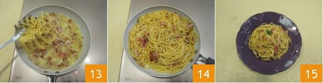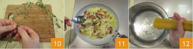 When the pasta is cooked al dente, drain it, and add it directly to the pan with the onion and bacon sauce 13 and let it cook for a few moments over high heat to enhance the flavor. Once ready 14, you can serve and garnish with the reserved bacon, thyme, and marjoram 15, then you can enjoy your vermicelli with onion and bacon sauce while still hot.