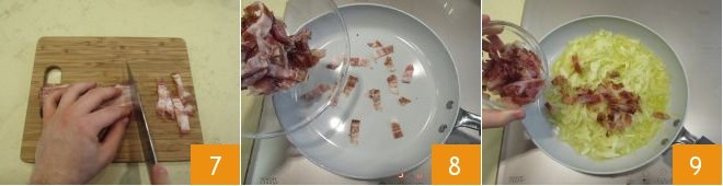 When the onions are almost cooked, cut the bacon into strips 7 and cook them in a non-stick pan, letting them sear over high heat for a few moments to make them crispy 8 and finally add them to the onions 9 (save a few pieces of bacon to garnish the dish).