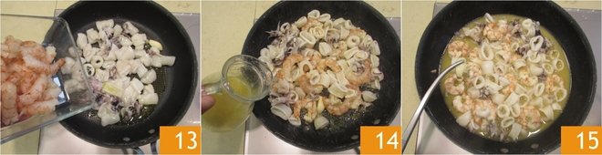 Put a pot of water on the stove to cook the pasta and add almost all of the shellfish liquid 10, reserving a little. In another pan, heat a dash of oil with a clove of garlic 11, then add the squid 12.