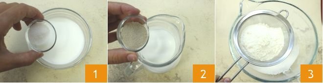 To make the chocolate viennoise, start by dissolving the salt in 200 ml of warm milk 1, in the remaining milk dissolve the dry yeast (alternatively you can use 0.4 oz of fresh yeast) 2 and set aside. Meanwhile, sift the flour into a stand mixer bowl 3 and