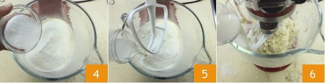 add the granulated sugar 4. Start kneading using the paddle attachment and slowly add the milk with the yeast 5, turn on the stand mixer to combine the mixture, then add the milk in which you dissolved the salt 6.
