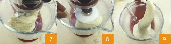 When the ingredients are well combined 7, replace the paddle with the dough hook and add the softened butter in pieces, one cube at a time 8. Once all the butter is added, knead for another 20 minutes until the dough detaches from the sides and becomes very elastic and smooth 9.