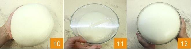 Form a dough ball 10, place the dough ball inside a bowl, cover with plastic wrap 11 and let it rise in the turned-off oven with the light on for an hour or until the dough has doubled in volume 12.