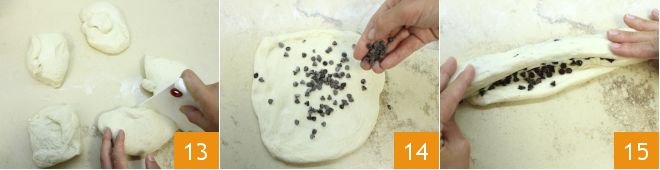 After this time, divide it into 6 pieces of about 8 oz each 13, flatten the dough balls slightly with your hands and fill them with chocolate chips 14. Fold the dough sheet 15