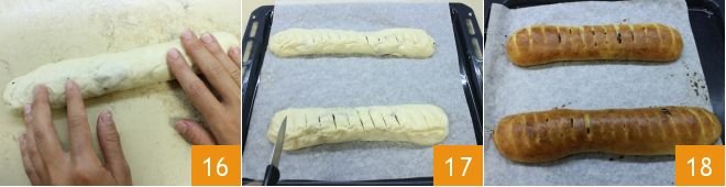 and roll it as if forming a baguette 16, place the viennoise on a baking sheet lined with parchment paper and let them rise for about 1.5 hours again in the turned-off oven with the light on. After this time, beat the egg yolk with two tablespoons of cream (or milk) and brush the surface of the viennoise with this mixture, then make crosswise cuts on the surface of the viennoise 17 and bake in a preheated static oven at 195°F for about 20 minutes or until they are golden on the surface 18 (if using a convection oven, bake at 185°F for 10-15 minutes). Your chocolate viennoise are ready, slice them and enjoy them for breakfast with a good cup of coffee!