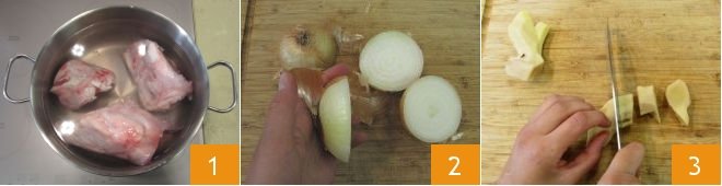 After 30 minutes, remove the bones from the pot 4 and discard the cooking water, then put the bones back in the same pot 5 and cover again with plenty of cold water 6.