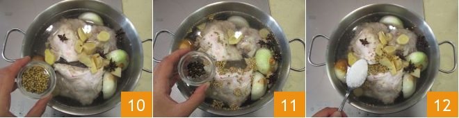 the coriander seeds 10, the whole peppercorns 11, and the coarse salt 12. Mix well and let it cook on low heat for 5 hours.