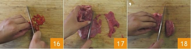 and slice the fresh chili into rings 16. Cut 200 g of sirloin for garnish into slices about 1/8 inch thick 17, while from the 200 g of sirloin for the broth you should cut chunks about 1 1/2 inches 18.