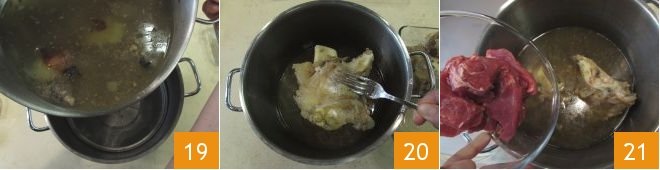 After 5 hours, strain the broth, keeping a moment aside the bones 19, then put them back in the pot with the strained broth 20. Add the sirloin chunks 21 and cook for another 30 minutes, always on low heat, then taste and adjust the salt if necessary.