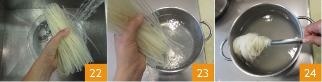 In the meantime, bring another pot of water to a boil, then rinse the noodles under cold running water 22 and pour them into the pot with boiling water 23, turn off the heat and let them soak for about 5 minutes. At this point, drain the noodles 24 and transfer them to the serving bowls, then proceed by adding the rest of the ingredients: