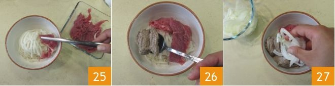 the slices of raw meat 25, a couple of pieces of cooked meat 26, a few slices of raw onion 27,
