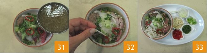 Pour the boiling broth over it 31, garnish with bean sprouts 32, and serve your beautiful Vietnamese pho! Serve the remaining garnishment ingredients in separate bowls so that everyone can add more to their bowl as desired 33!