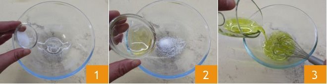 To prepare the vinaigrette, start by taking a large bowl and adding the salt 1. Add the white wine vinegar 2 and dissolve the salt in the vinegar by stirring with a hand whisk. Continue whisking as you pour in the oil in a steady stream to emulsify 3. If you prefer, you can also use a flat spring whisk or a mixer.