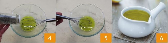 Adjust with pepper 4 and keep whisking 5 until you obtain a homogeneous vinaigrette. The result should not be separated, but the oil should completely emulsify with the vinegar. At this point, the vinaigrette will be ready to use 6.